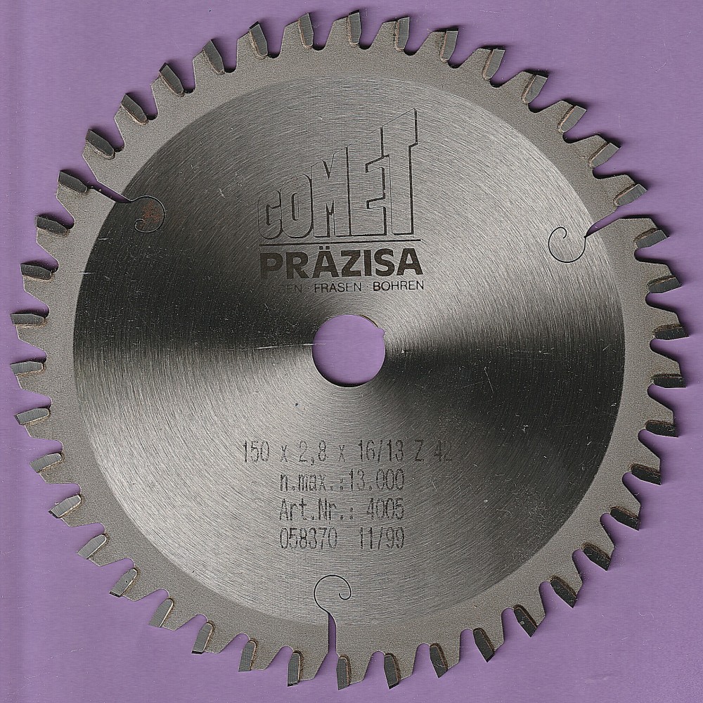 Schnittbreite 2,8 mm Stammblattstärke 2,0 mm 42 Zähne Trapezzahn / Flachzahn negativ Spanwinkel -5°, Freiwinkel 20° max. 13.000 UPM...