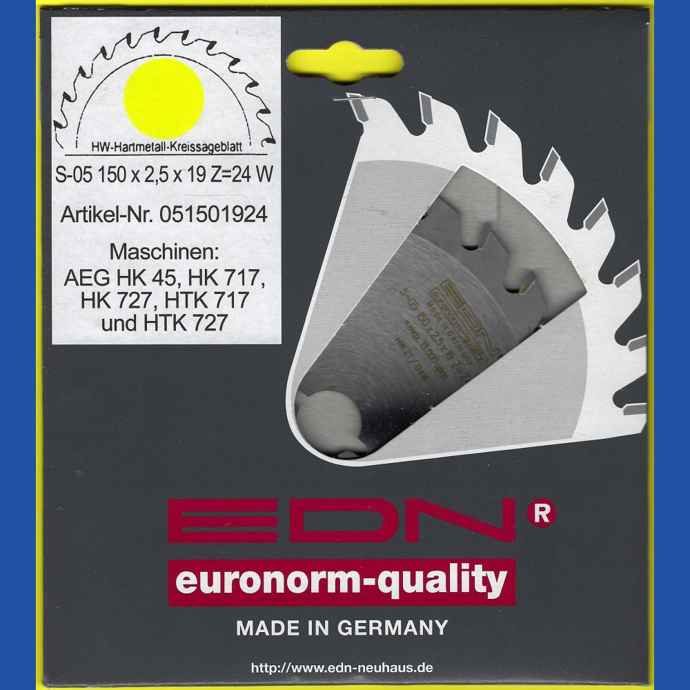 Die Ernst D. Neuhaus GmbH & Co. KG ist ein im Wuppertaler Stadtteil Cronenberg ansässiges Traditionsunternehmen, dessen Focus auf der Produktion hochwertiger Hartmetall-bestückter Kreissägeblätter für den gewerblichen Bereich liegt. Die Marke EDN steht konsequent für Qualität "Made in Germany". Aus einem kleinen Restposten kann ich Ihnen eine Reihe von Sägeblättern dieses Herstellers günstig anbieten! Außerdem nehme ich nach der Schließung von H.O. Schumacher+Sohn jetzt auch diverse Kreissägeblätter in mein reguläres Sortiment auf, liefern kann ich auf Anfrage das Gesamtprogramm (Katalog ohne Preise als PDF-Datei).