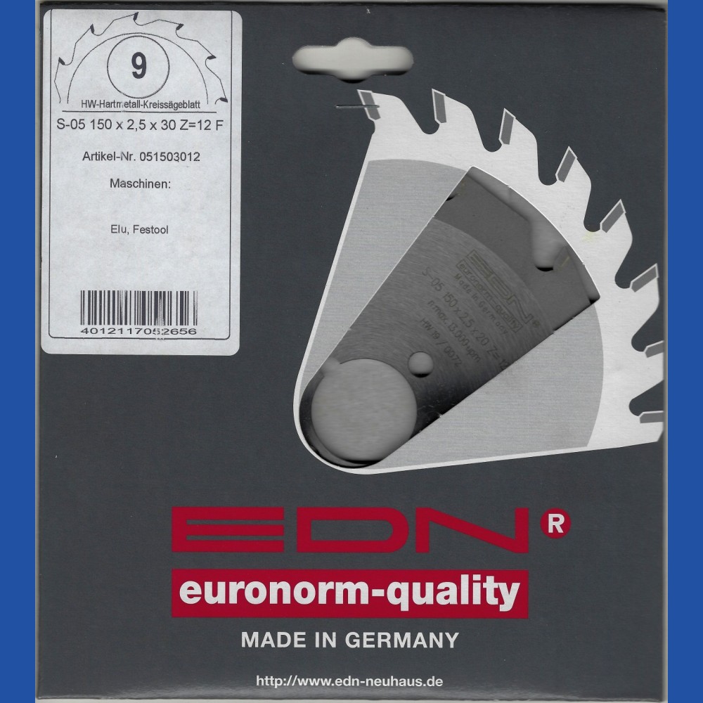 Die Ernst D. Neuhaus GmbH & Co. KG ist ein im Wuppertaler Stadtteil Cronenberg ansässiges Traditionsunternehmen, dessen Focus auf der Produktion hochwertiger Hartmetall-bestückter Kreissägeblätter für den gewerblichen Bereich liegt. Die Marke EDN steht konsequent für Qualität "Made in Germany". Aus einem kleinen Restposten kann ich Ihnen eine Reihe von Sägeblättern dieses Herstellers günstig anbieten! Außerdem nehme ich nach der Schließung von H.O. Schumacher+Sohn jetzt auch diverse Kreissägeblätter in mein reguläres Sortiment auf, liefern kann ich auf Anfrage das Gesamtprogramm (Katalog ohne Preise als PDF-Datei).