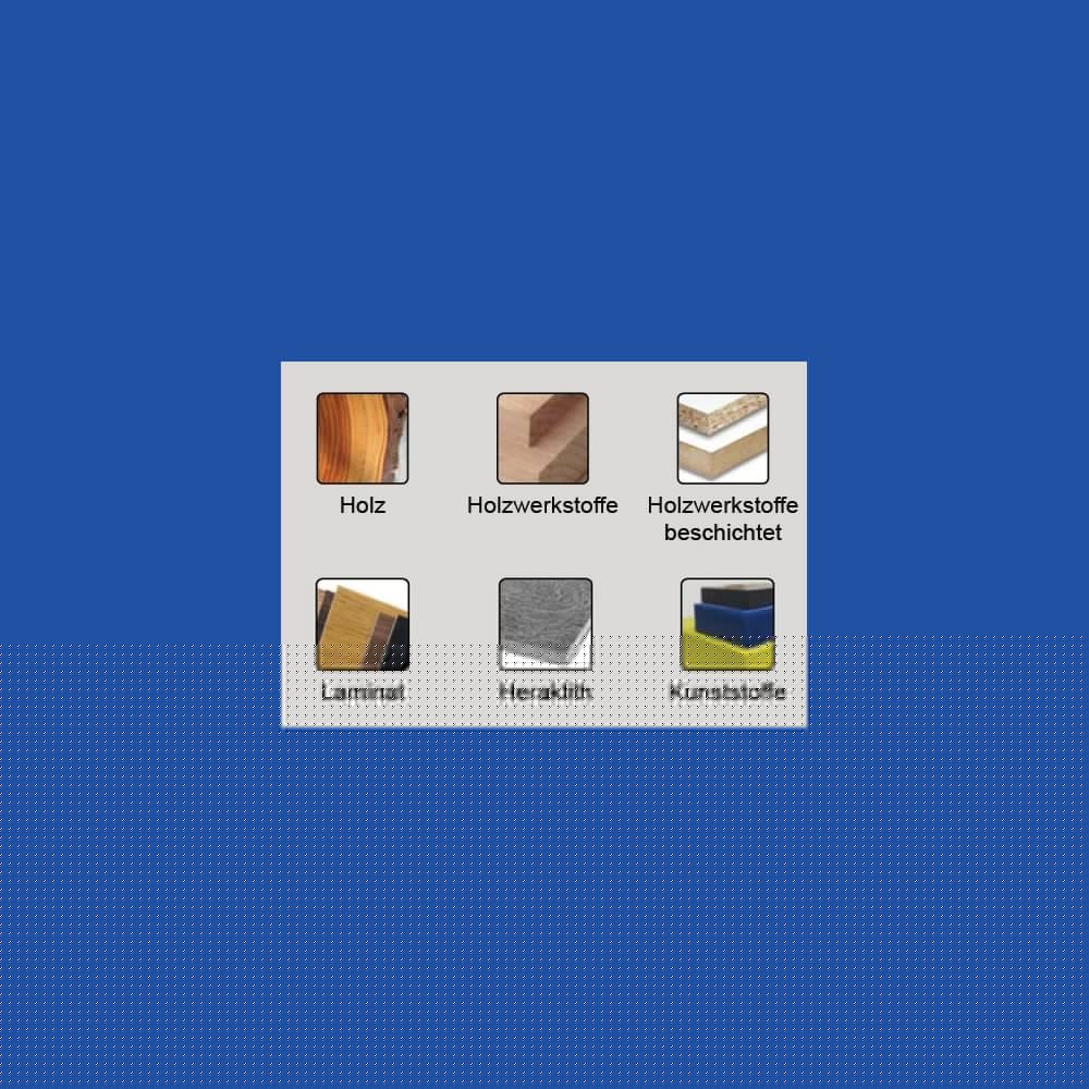 | Eignung für Holz | beschichtete Spanplatten, Spanplatten unbeschichtet, Weichholz, Hartholz, Tropenholz, Holz allgemein |