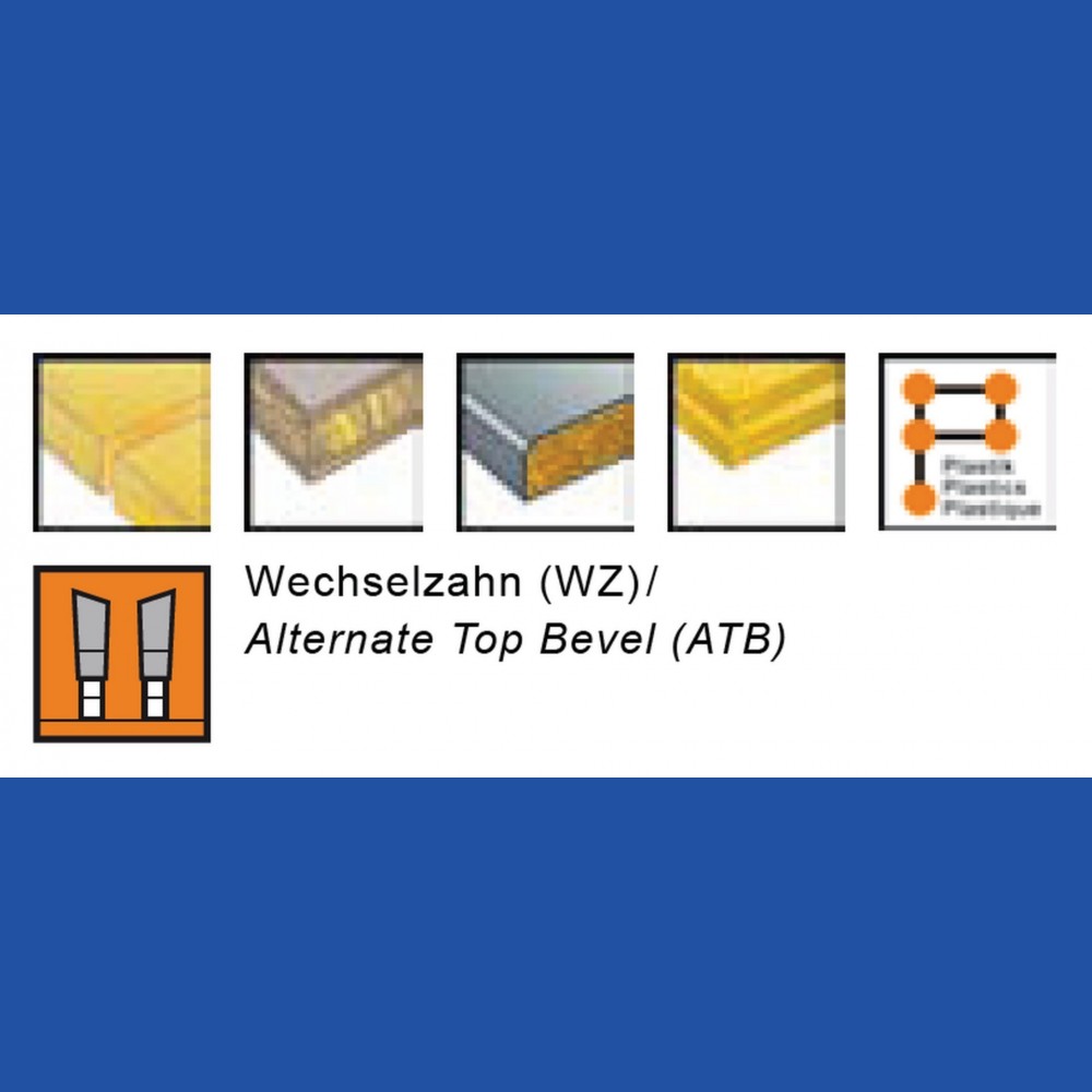 36 bis 120 Wechselzähne sorgen für beste Schnittqualität bei hoher Schnittleistung auch bei beschichteten und furnierten Plattenwerkstoffen. Die Ausführungen für Kapp- und Gehrungssägen in den Durchmessern 250 und 260 mm eignen sich mit negativer Zahnstellung speziell für diesen Sägentyp. Ab dem Durchmesser 250 mm werden die Bezeichnungen "Typ GW" (Gleichlauf-Wechselzahn) und "Typ KW" (Kunststoff-Wechselzahn) verwendet.