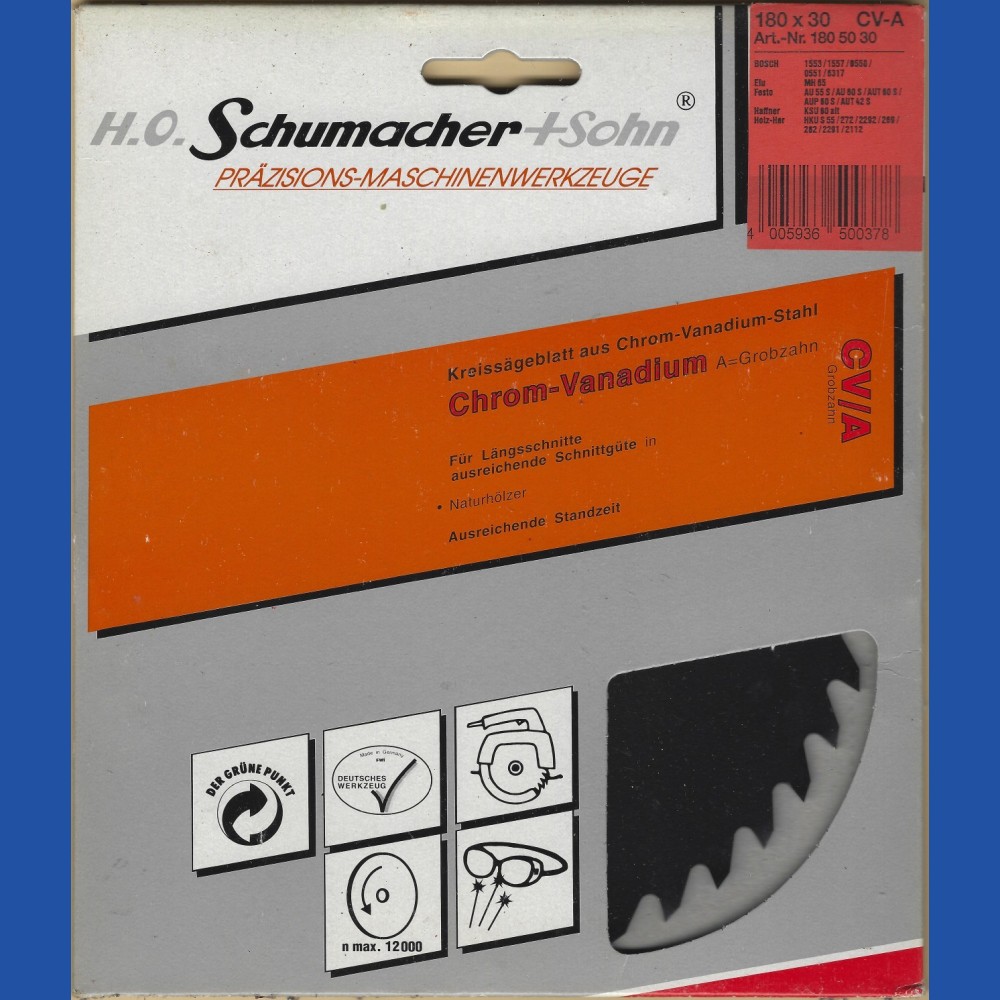 Die preisgünstigen H.O. Schumacher+Sohn Kreissägeblätter Chrom-Vanadium besitzen keine aufgelöteten Zähne, sondern bestehen komplett in einem Stück aus Chrom-Vanadium-Stahl (CV), der eine höhere Standzeit besitzt als normaler Chromstahl (CS). Chrom-Vanadium ist wesentlich robuster gegen Stöße und Schläge als das relativ spröde Hartmetall, die Sägeblätter können deshalb auch unter rauheren Einsatzbedingungen nicht so leicht beschädigt werden. Dadurch eignen sich die großen Durchmesser sehr gut zum Sägen von frischem Brennholz, in dem sich ja auch einmal Fremdkörper befinden können, wodurch Hartmetallzähne leicht beschädigt werden, während die Zähne des CV-Blatts lediglich schneller stumpf werden.
