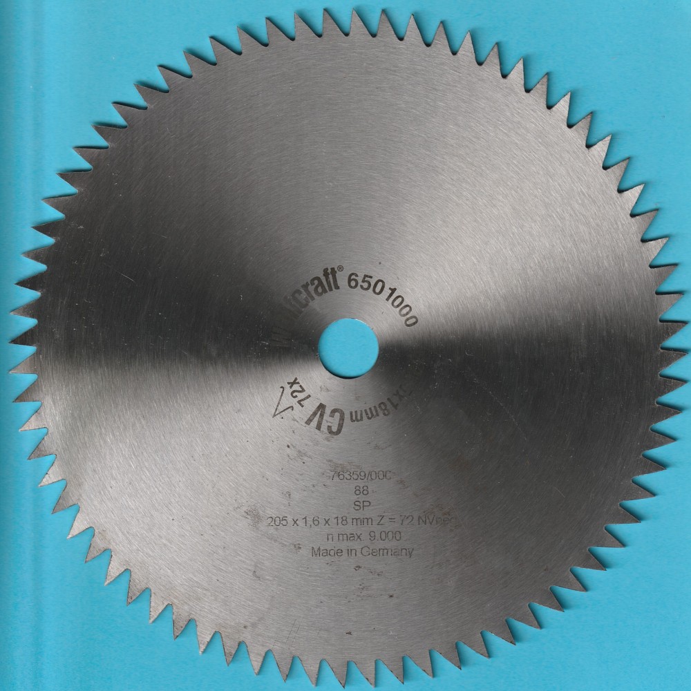 Die Zahl der geschränkten Spitzzähne beträgt 72. Der negative Schnittwinkel ermöglicht ein sicheres Arbeiten mit Kapp- und Gehrungssägen, bei denen anders als bei Hand- oder Tischkreissägen das Sägeblatt von oben ins aufliegende Schnittgut eintaucht, das Schnittgut wird nicht in das Sägeblatt hineingezogen, sondern gegen die Auflage gedrückt. Das Sägeblatt taucht leicht ins Material ein und beansprucht den Motor der Säge nur gering.