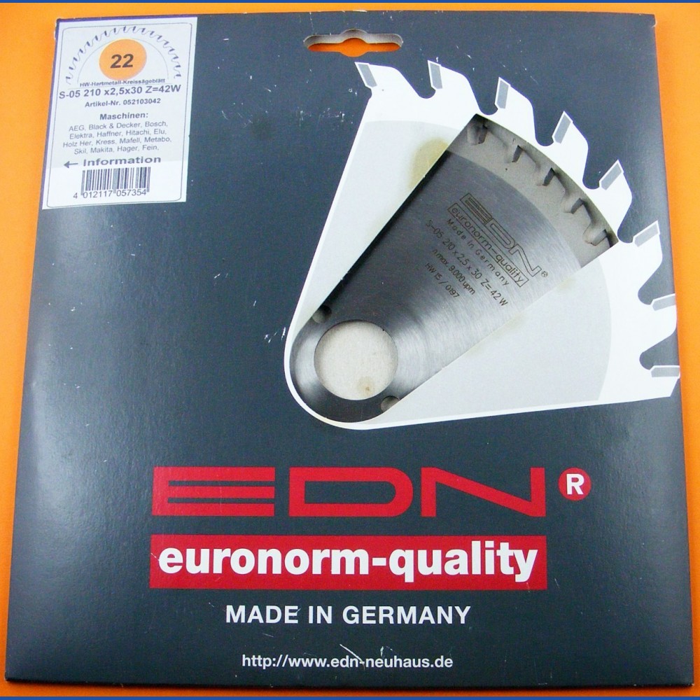 Die Ernst D. Neuhaus GmbH & Co. KG ist ein im Wuppertaler Stadtteil Cronenberg ansässiges Traditionsunternehmen, dessen Focus auf der Produktion hochwertiger Hartmetall-bestückter Kreissägeblätter für den gewerblichen Bereich liegt. Die Marke EDN steht konsequent für Qualität "Made in Germany". Aus einem kleinen Restposten kann ich Ihnen eine Reihe von Sägeblättern dieses Herstellers günstig anbieten! Außerdem nehme ich nach der Schließung von H.O. Schumacher+Sohn jetzt auch diverse Kreissägeblätter in mein reguläres Sortiment auf, liefern kann ich auf Anfrage das Gesamtprogramm (Katalog ohne Preise als PDF-Datei).