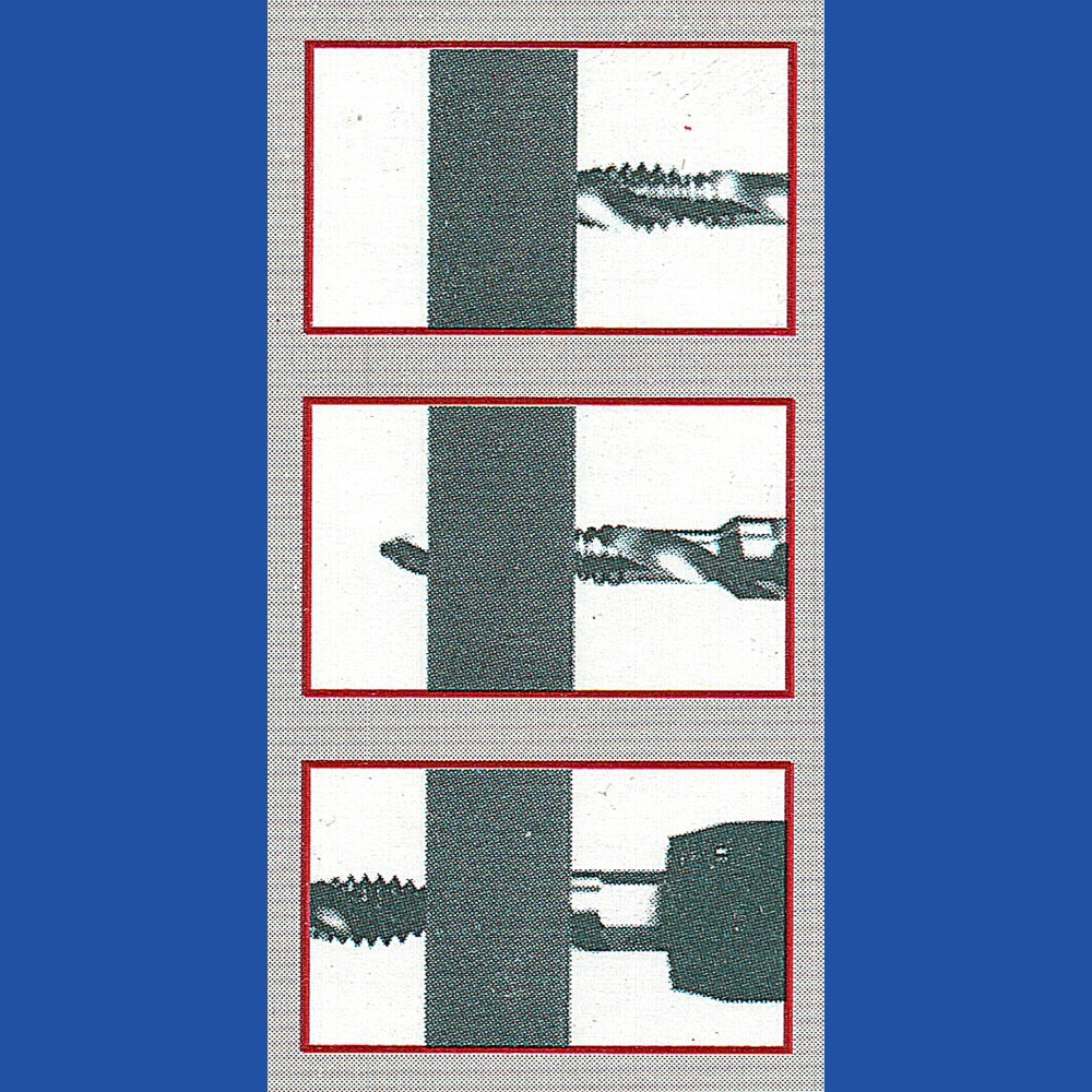 Zunächst wird das Kernloch gebohrt, dann das Gewinde geschnitten und gleich entgratet, beim Rücklauf wird dann das Gewinde noch gesäubert.